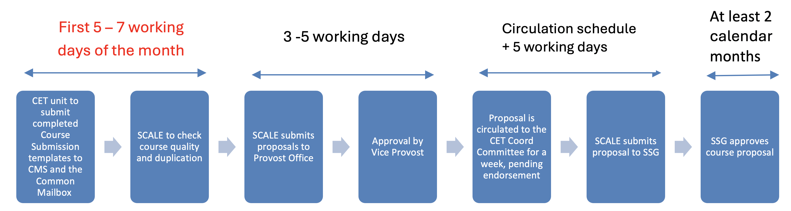 • Should there be any follow-up queries from SSG, the SCALE QM team will communicate the queries to CET units. It is recommended that CET units reply within 3 working days, failing which, the course application will be deemed as withdrawn.